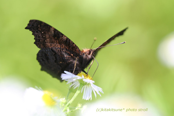 < 4/25 撮影 >【チョウ目 タテハチョウ科 タテハチョウ亜科 クジャクチョウ】春の野草たちが咲き出して、北海道にも遅い春がやってきました。雪解け後の初散策で出会ったのはクジャクチョウ。春一番に蝶に出会えると、とっても嬉しくなります~♪★タテハチョウ亜科の中で越冬する種類では・ 翅の表は、あざやかな色をしているが、 裏面は、枯葉や土の色によく似た保護色をしている。(手持ち図鑑より) 過去画像にクジャクチョウの裏面のがあったので載せますね。