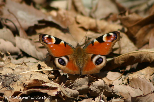 【チョウ目 タテハチョウ科 タテハチョウ亜科 クジャクチョウ】越冬する蝶、クジャクチョウ。この蝶に出会うようになると「春が来たな」と感じます。カメラ持っていなかったのでスマホで・・
