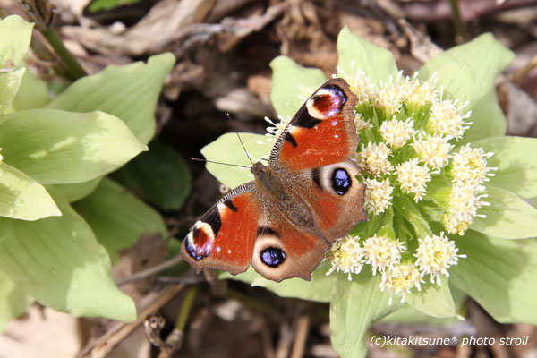 < 4/25 撮影 >【チョウ目 タテハチョウ科 タテハチョウ亜科 クジャクチョウ】春の野草たちが咲き出して、北海道にも遅い春がやってきました。雪解け後の初散策で出会ったのはクジャクチョウ。春一番に蝶に出会えると、とっても嬉しくなります~♪★タテハチョウ亜科の中で越冬する種類では・ 翅の表は、あざやかな色をしているが、 裏面は、枯葉や土の色によく似た保護色をしている。(手持ち図鑑より) 過去画像にクジャクチョウの裏面のがあったので載せますね。