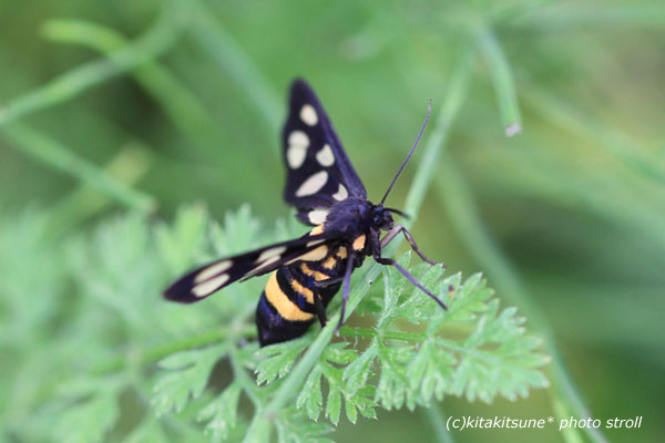 翅の鹿の子模様は白で、腹部の2本のスジは黄色です。